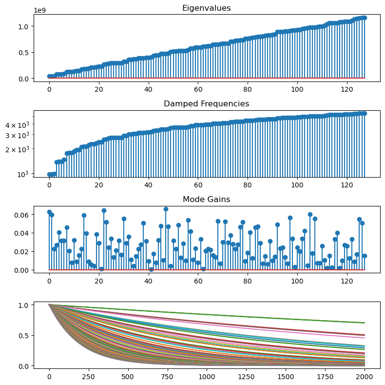 m = MATERIALS["polycarbonate"]s = System(m)fig, axs = plt.subplots(4, 1, figsize=(8, 8))# plot the eigenvaluesaxs[0].stem(s.eigenvalues)axs[0].set_title("Eigenvalues")# plot the damped frequenciesaxs[1].stem(s.damped_frequencies)axs[1].set_title("Damped Frequencies")axs[1].set_yscale("log")# plot node gainsaxs[2].stem(np.abs(s.get_mode_gains(100)))axs[2].set_title("Mode Gains")# plot amplitude envelopes given by damping coefficientsaxs[3].plot( np.exp(-s.damping_coefficients * np.linspace(0, 2000.0/44100.0, 2000)[..., None]))fig.tight_layout()fig.show()